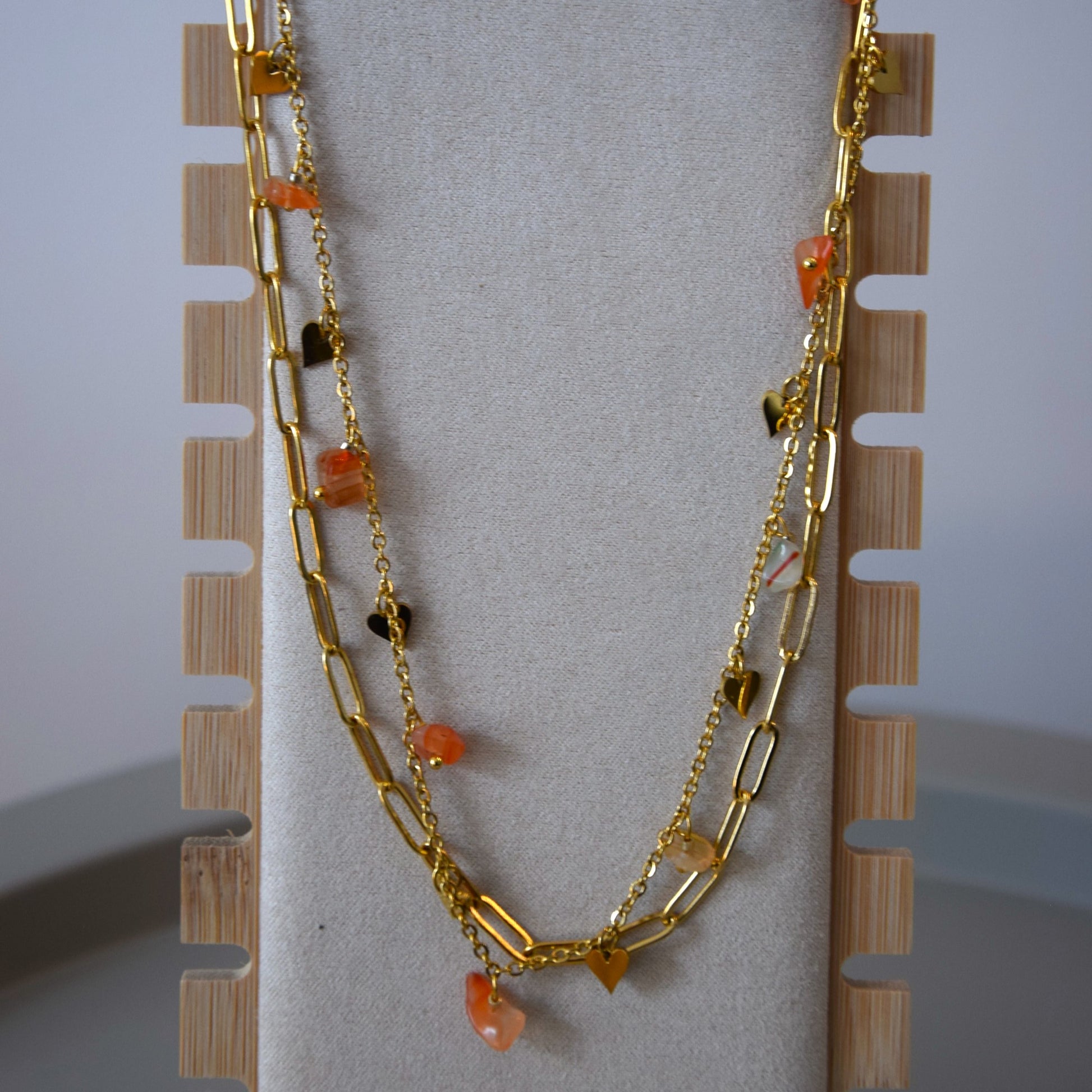 Collier double avec pierres et pendentifs cœur.